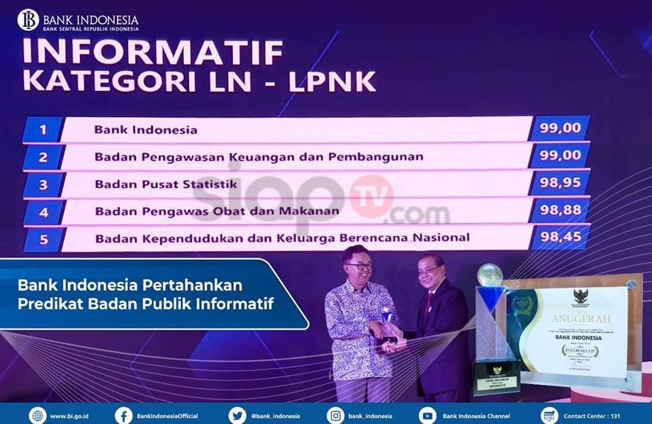 siaptv.com – Komisi Informasi Pusat (KIP) RI kembali menyematkan predikat Badan Publik Informatif tahun 2022 kepada Bank Indonesia (BI), sebuah prestasi tertinggi yang juga diperoleh BI di tahun sebelumnya. Penghargaan ini diberikan dalam Anugerah Monitoring dan Evaluasi (Monev) Keterbukaan Informasi Publik (KIP) Badan Publik (BP) tahun 2022, di Tangerang (14/12), diserahkan langsung oleh Menteri Koordinator Politik Hukum dan HAM, Mahfud MD, mewakili Wakil Presiden RI, Ma’ruf Amin.