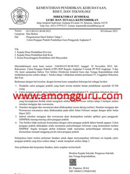Di antara Guru.com. Pengumuman Hasil Seleksi Tahap 1 Paket Pendidikan Guru Aktivis Guru yang Menjanjikan (PPP) 9 dikeluarkan oleh Direktorat Jenderal Guru dan Pendidik, Kemendikbudristek.