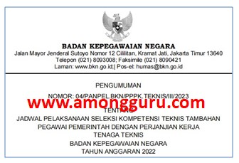 Di antara Guru.com. Badan Perekrutan Negara (BKN) diterbitkan Pengumuman BKN Nomor 04/PANPEL.BKN/PPPK.TEKNIS/III/2023 tentang Jadwal Seleksi Tambahan Kompetensi Teknis PNS Kontrak Kerja Bagi Staf Teknis Badan Kepegawaian Tahun Anggaran 2022.