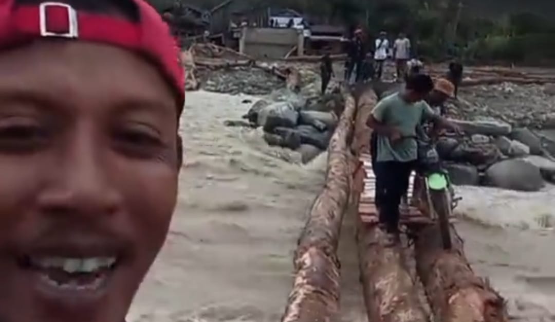 FOTO ; Momen bahagia warga Beutong Ateuh setelah berhasil membangun jembatan darurat. (TikTok/TOKO DAMRY)