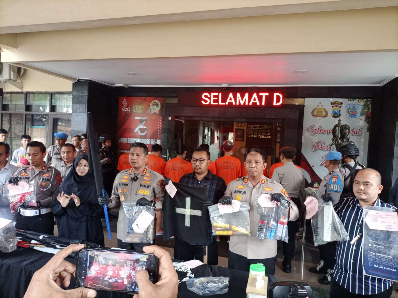 “Barang bukti kita amankan diantaranya bendera identik kelompok anarko, batu, kaleng cat semprot, sapu tangan warna cokelat dengan noda darah, tiga buah pecahan bom asap, poster dan barang-barang lainnya,”pungkas Kombes Budi.