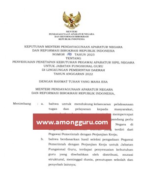 Di antara Guru.com. ditetapkan Menteri PANRB KepmenPANRB Nomor 149 Tahun 2023 tentang Penyesuaian Penetapan Kebutuhan PNS Jabatan Fungsional Guru di Lingkungan Pemerintah Daerah Tahun Anggaran 2022.